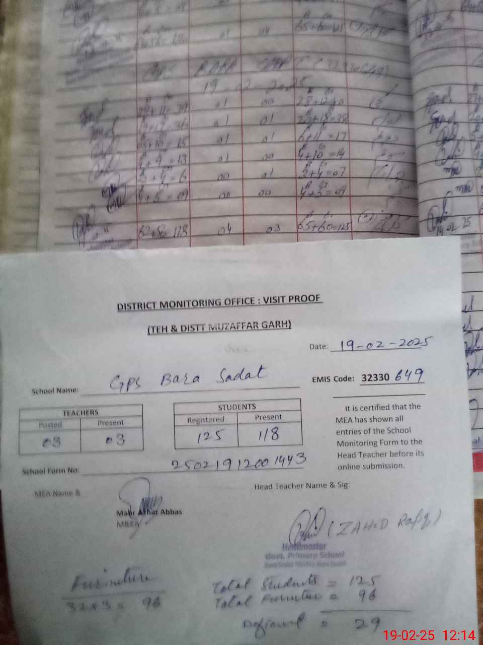 | EMIS Code: 32330649 | Name of School: GPS BARA SADAT | |||