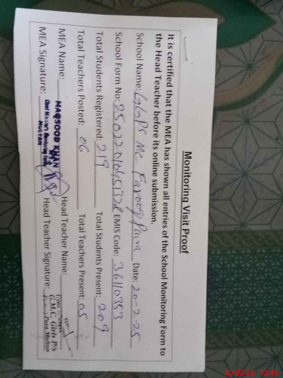 | EMIS Code: 36110353 | Name of School: GGPS MC FAROOQ PURA MULTAN | |||