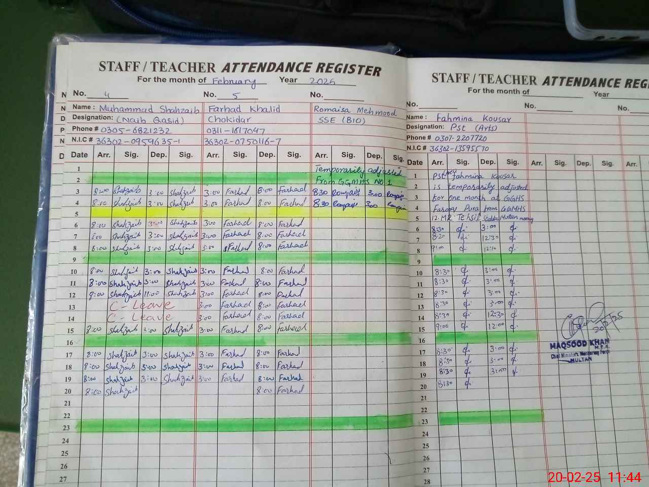 | CNIC | Full Name | Designation | R/C | Absence during last cal. month |