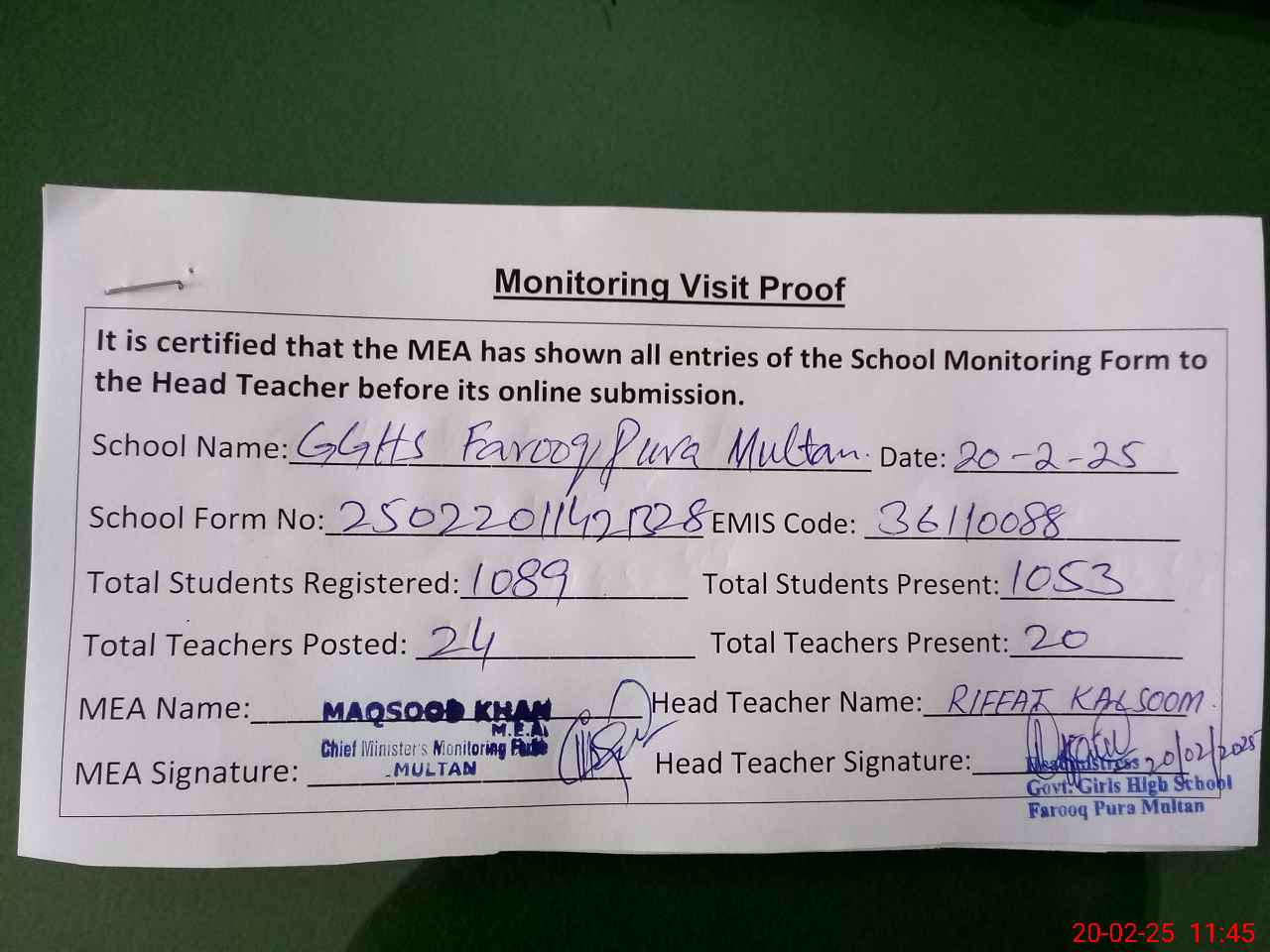 | Attendance Register | Head Teacher | MEA with School | Visit Proof |