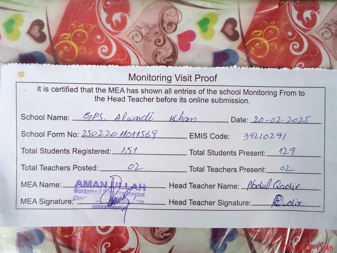 | EMIS Code: 39210291 | Name of School: GPS ALWARDI KHAN | |||