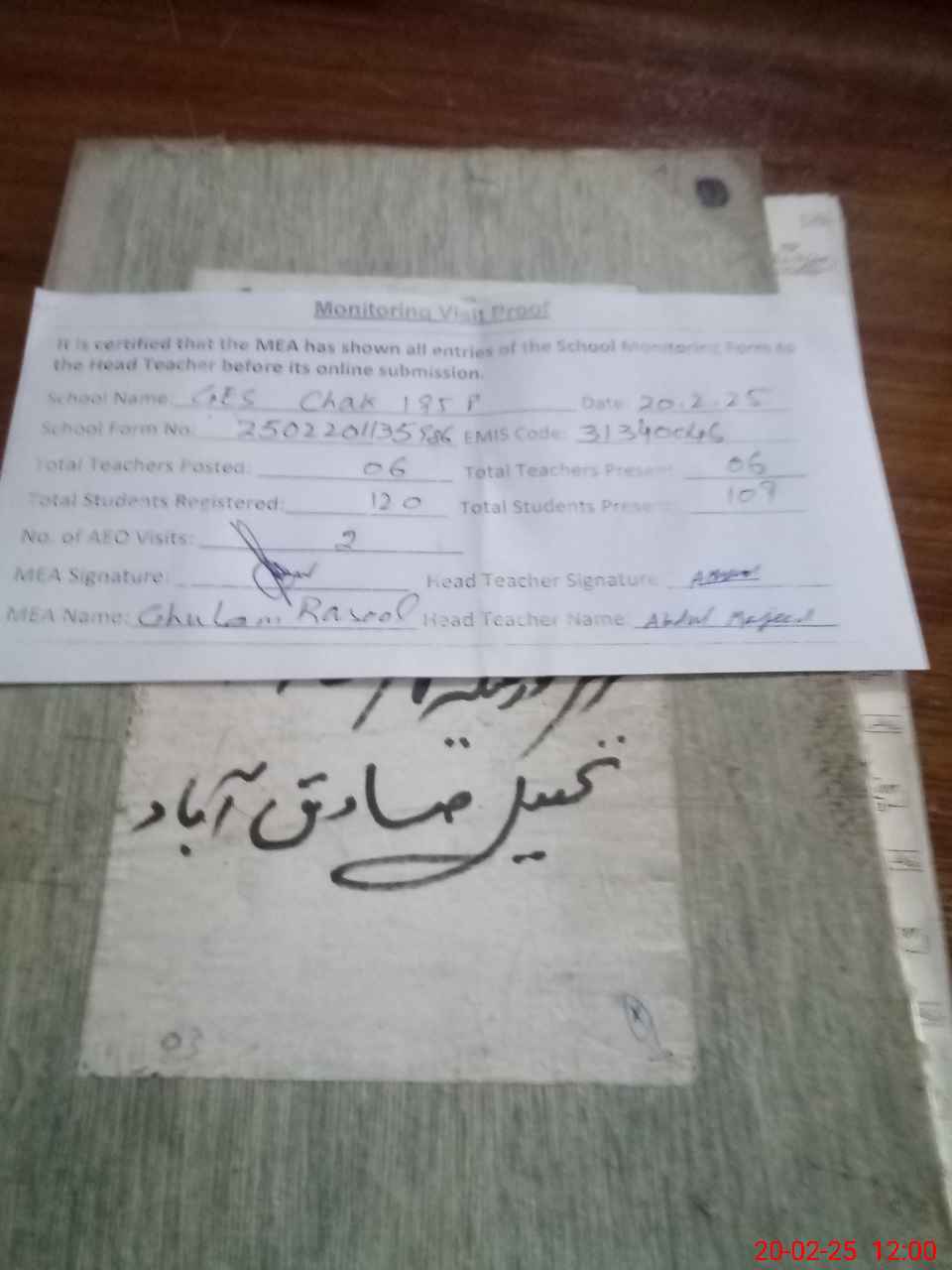 | Attendance Register | Head Teacher | MEA with School | Visit Proof |