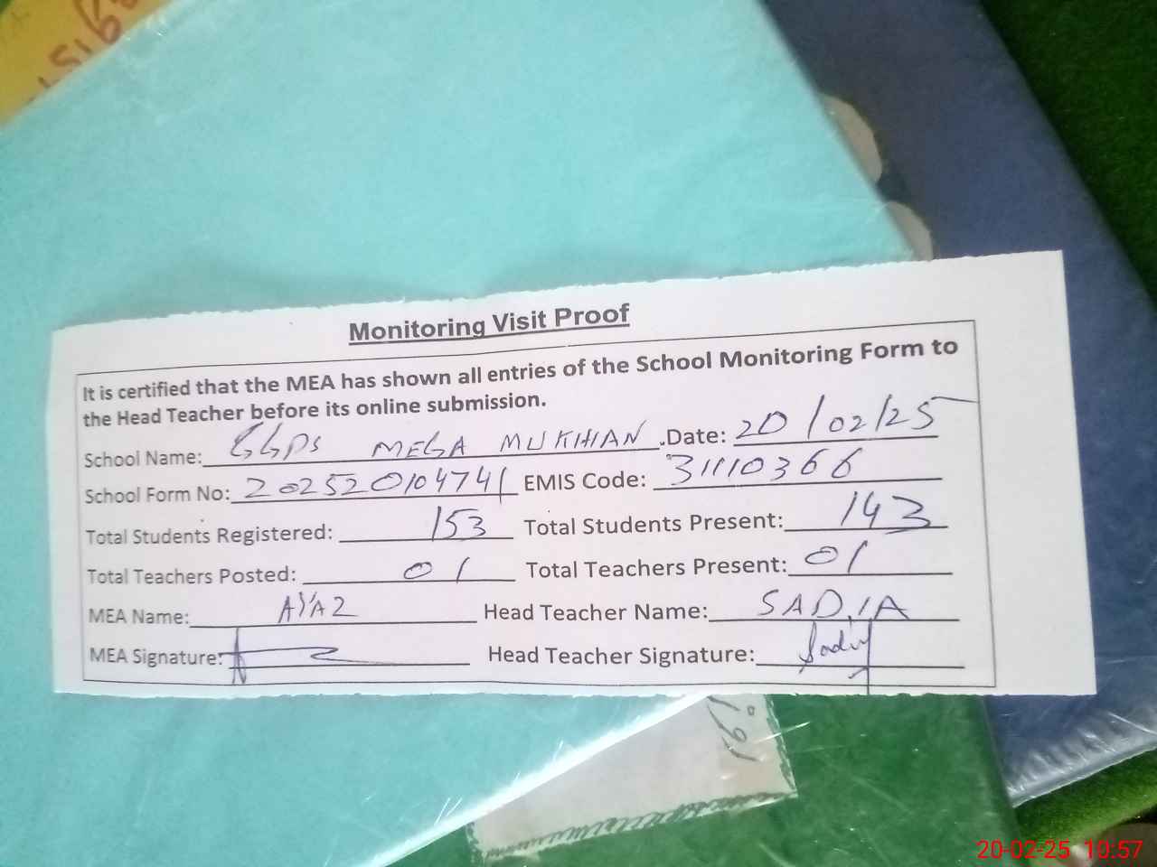 | Attendance Register | Head Teacher | MEA with School | Visit Proof |