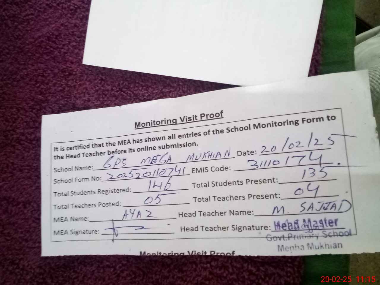 | EMIS Code: 31110174 | Name of School: GPS MEGHA MUKHIAN | |||