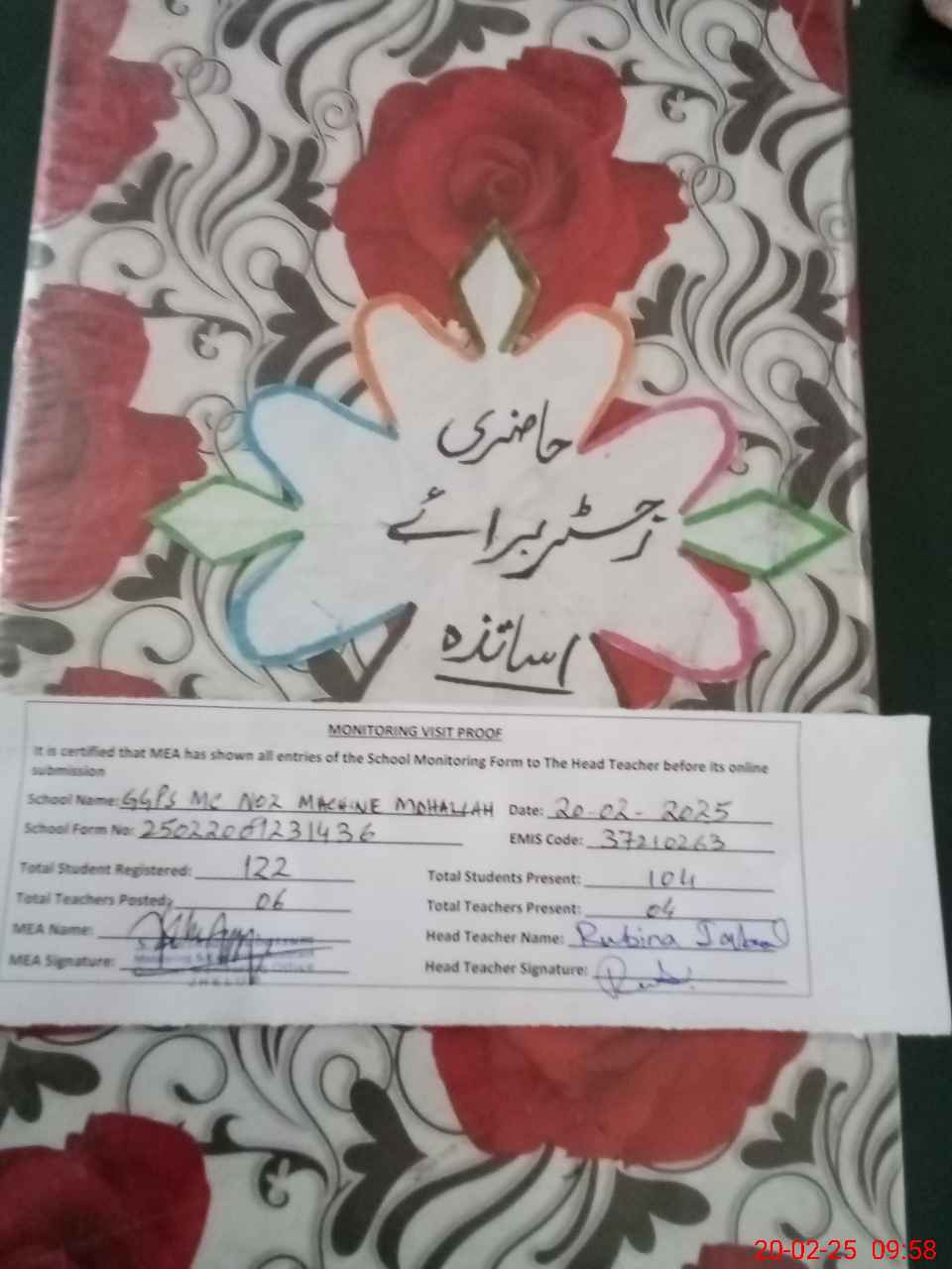 | Attendance Register | Head Teacher | MEA with School | Visit Proof |