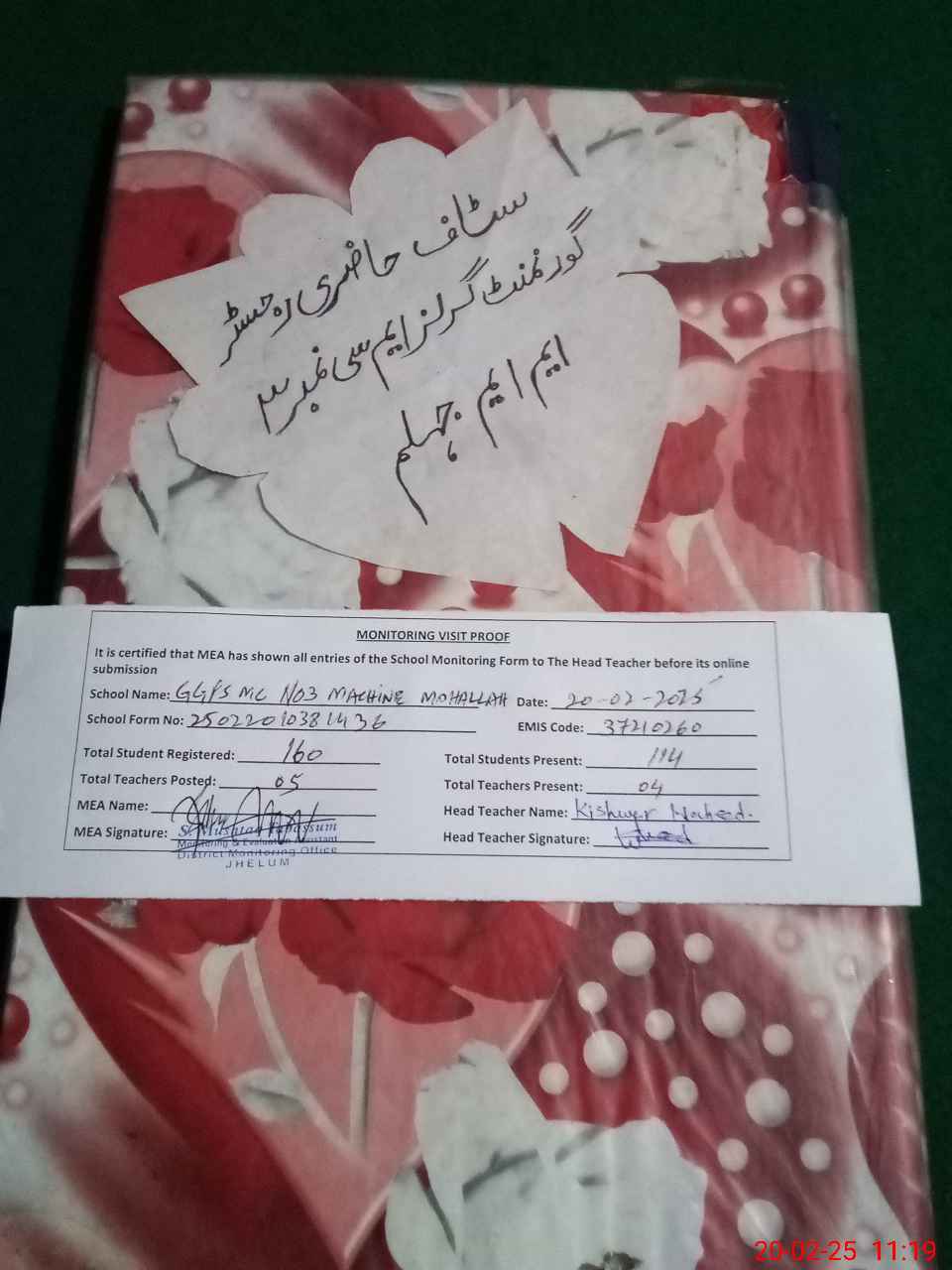 | Attendance Register | Head Teacher | MEA with School | Visit Proof |