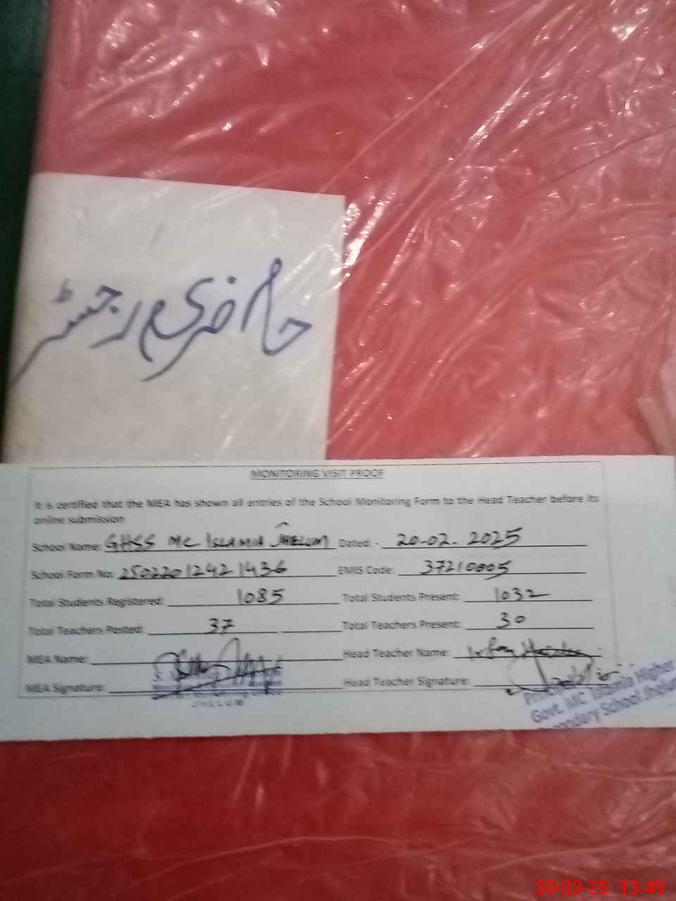 | EMIS Code: 37210005 | Name of School: GHSS MC ISLAMIA JHELUM | |||