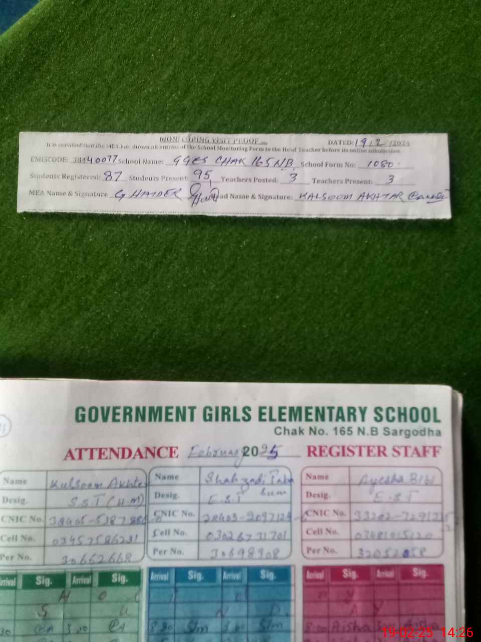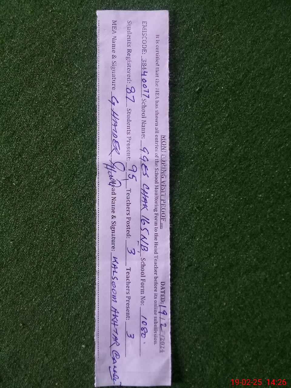 | Attendance Register | Head Teacher | MEA with School | Visit Proof |