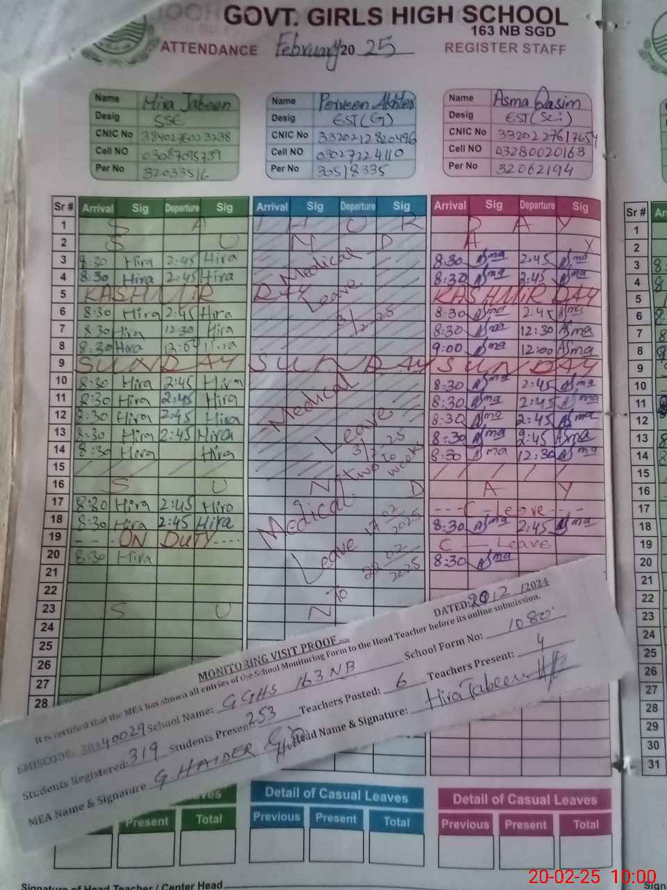 | CNIC | Full Name | Designation | R/C | Absence During Last Calender Month |