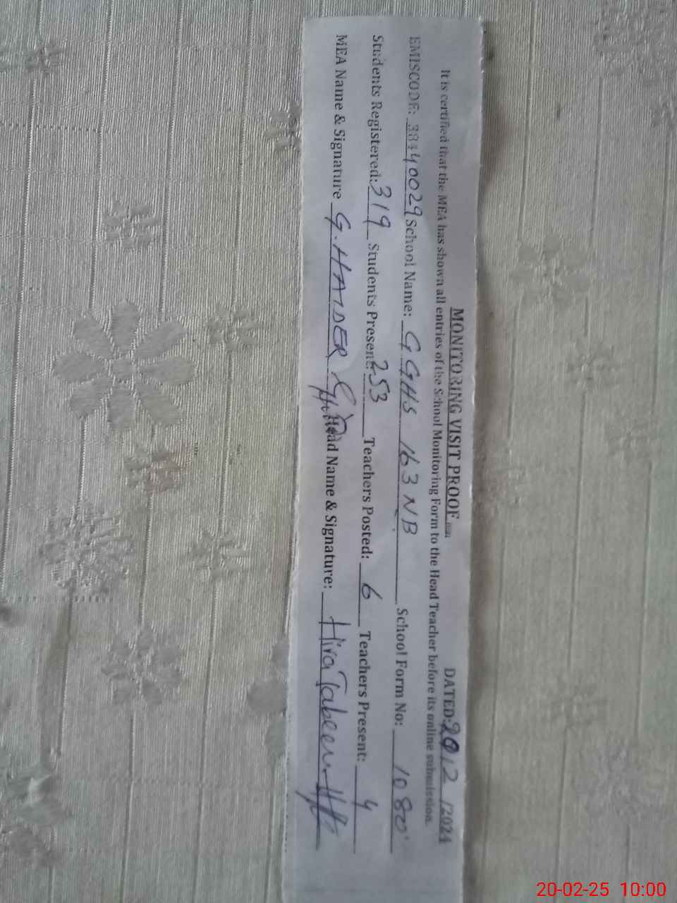 | Attendance Register | Head Teacher | MEA with School | Visit Proof |