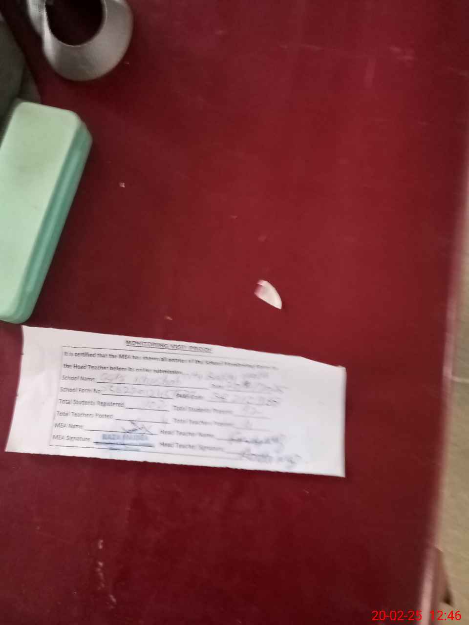 | Attendance Register | Head Teacher | MEA with School | Visit Proof |
