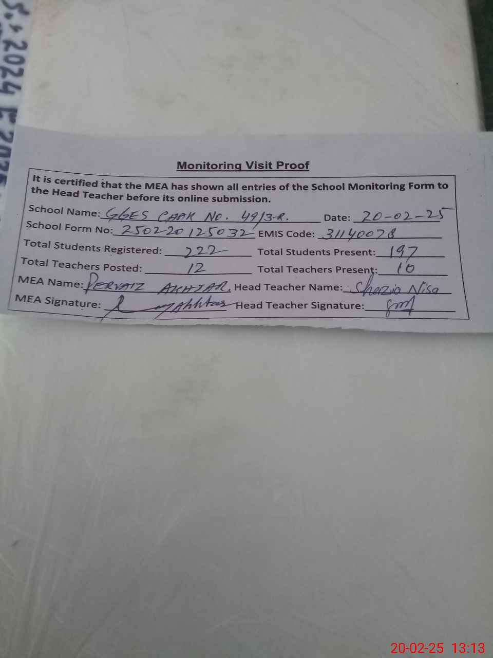 | Attendance Register | Head Teacher | MEA with School | Visit Proof |