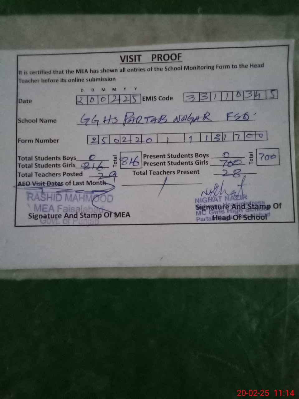 | Attendance Register | Head Teacher | MEA with School | Visit Proof |