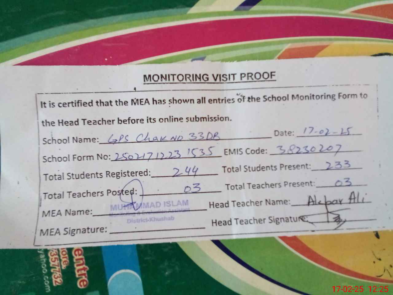 | EMIS Code: 38230207 | Name of School: GPS CHAK NO. 33/DB | |||