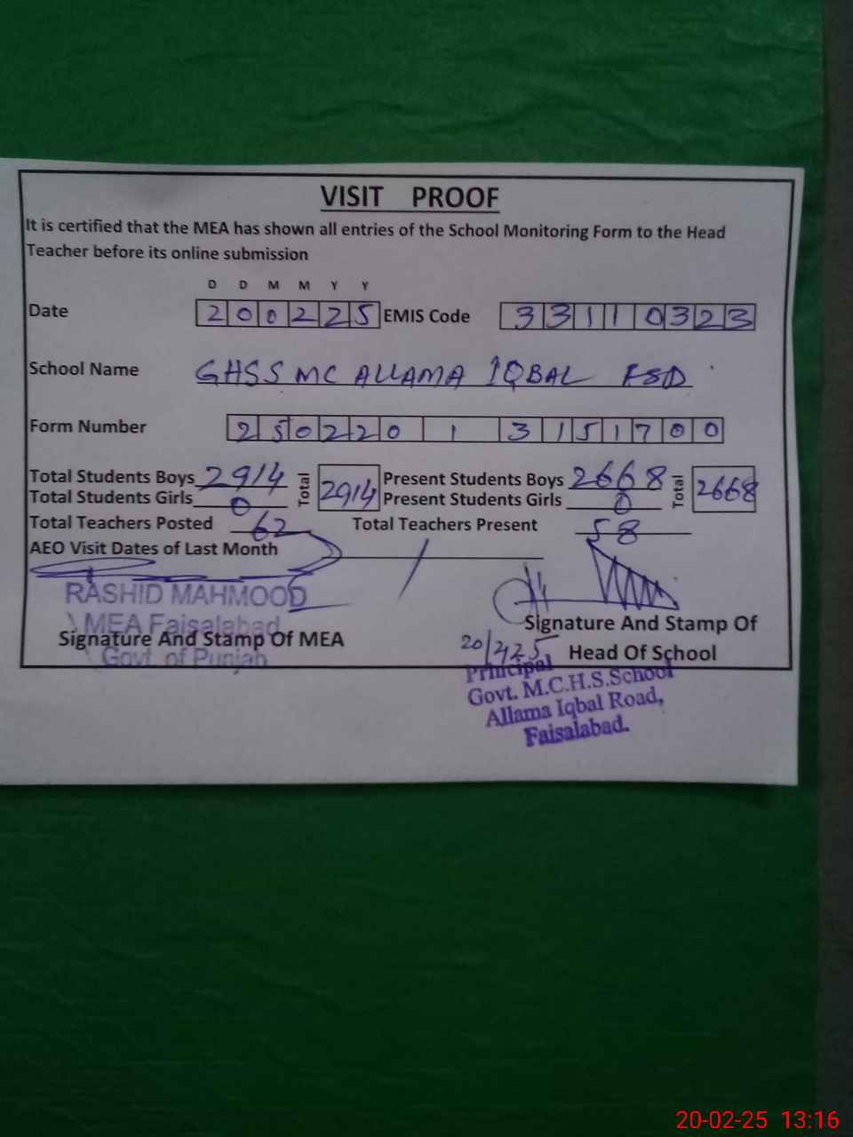 | EMIS Code: 33110323 | Name of School: GHSS MC ALAMA IQBAL FSD | |||