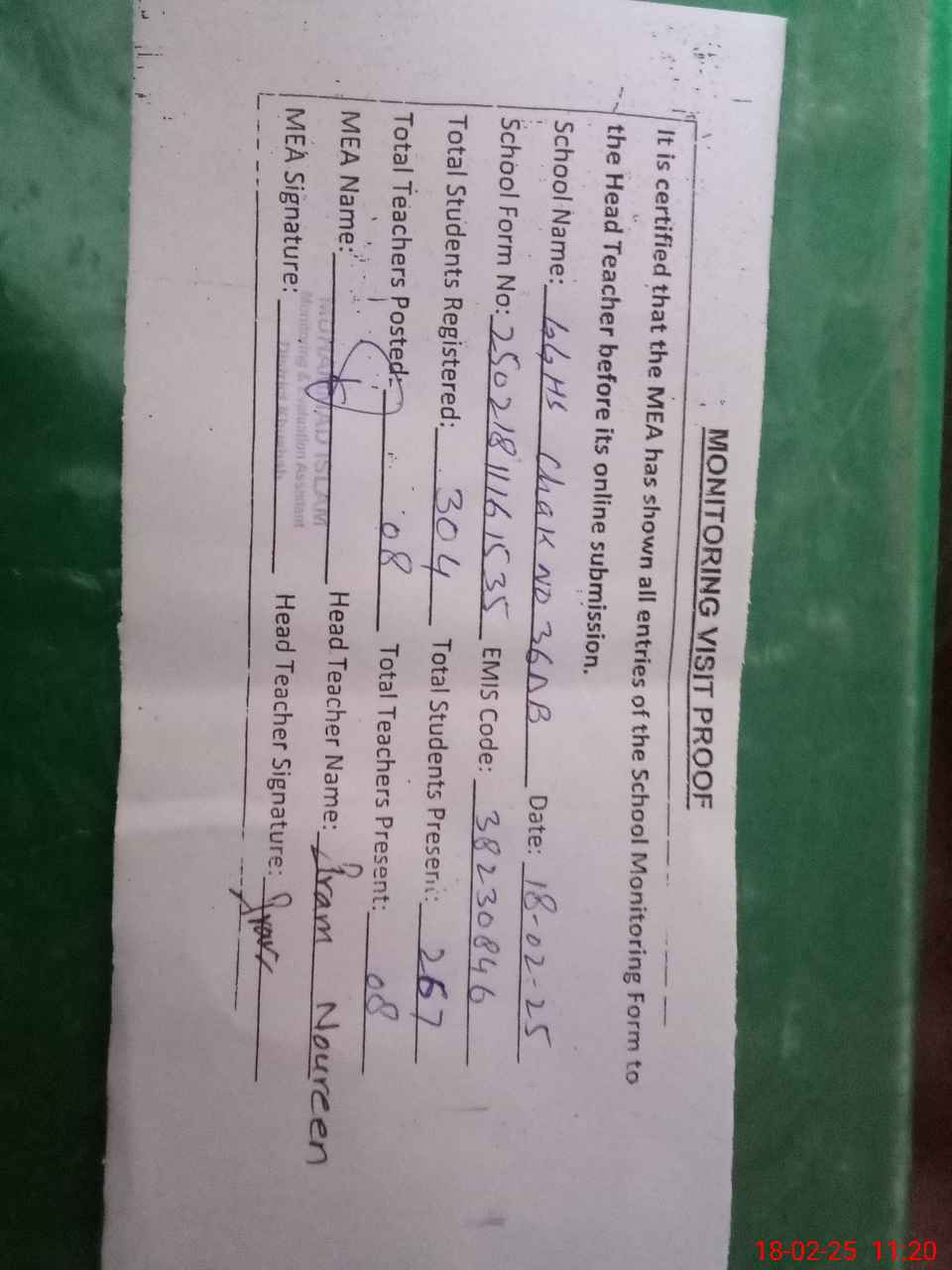 | EMIS Code: 38230846 | Name of School: GGHS CHAK NO 36 DB | |||