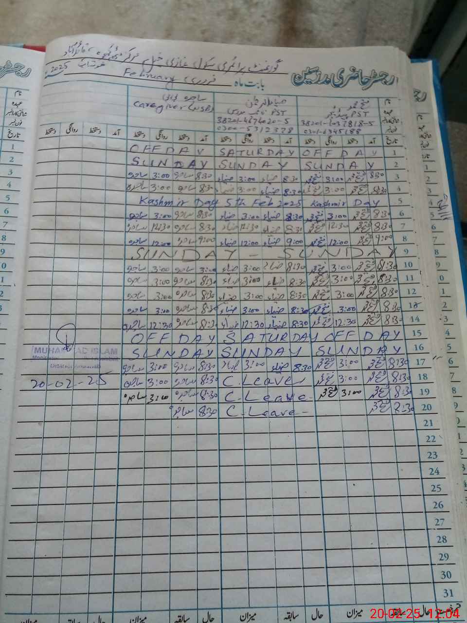 | CNIC | Full Name | Designation | R/C | Absence During Last Calender Month |