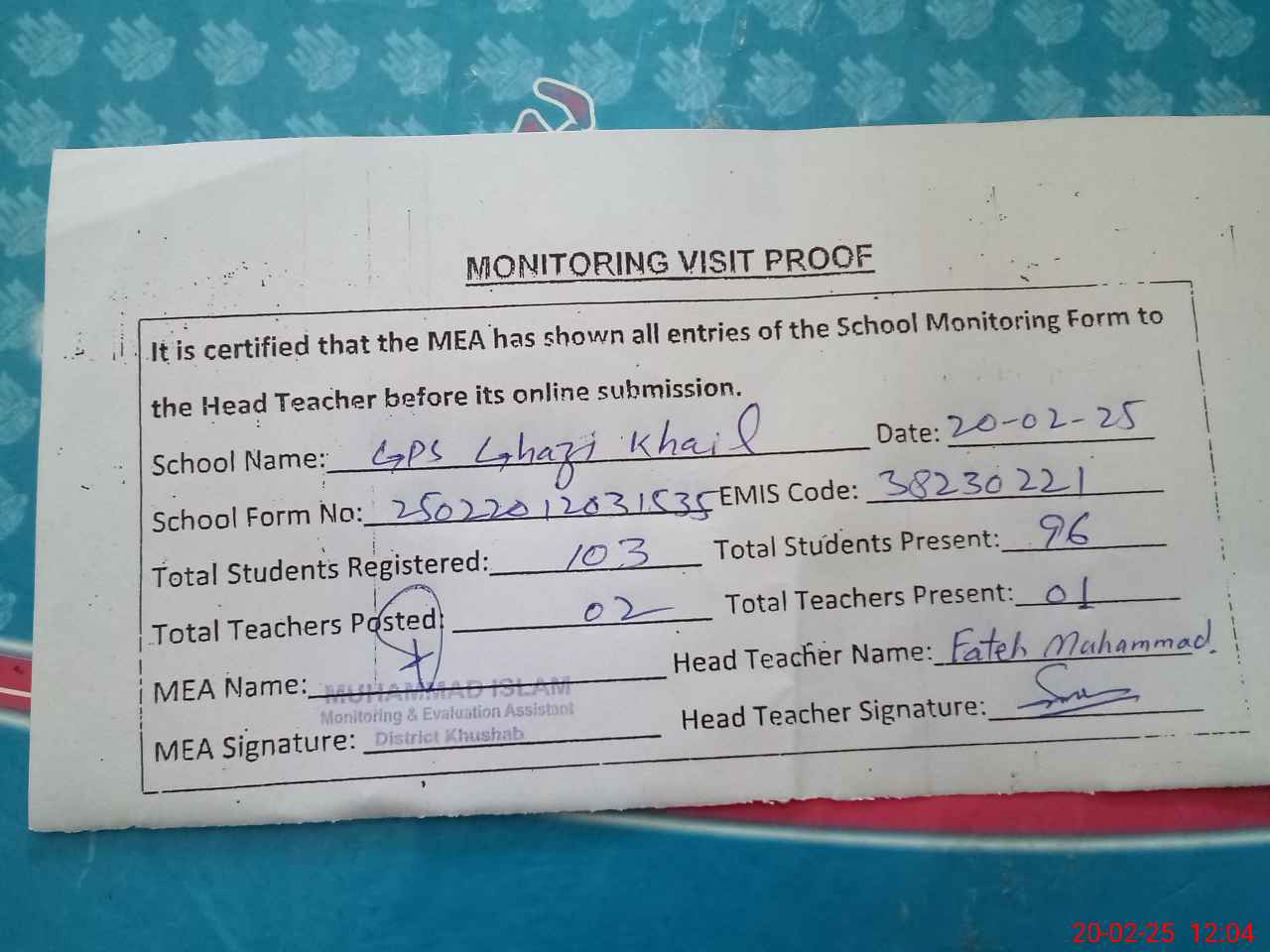 | Attendance Register | Head Teacher | MEA with School | Visit Proof |