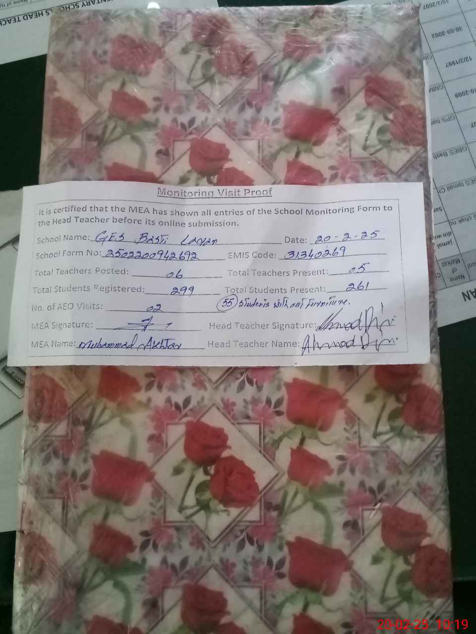 | Attendance Register | Head Teacher | MEA with School | Visit Proof |