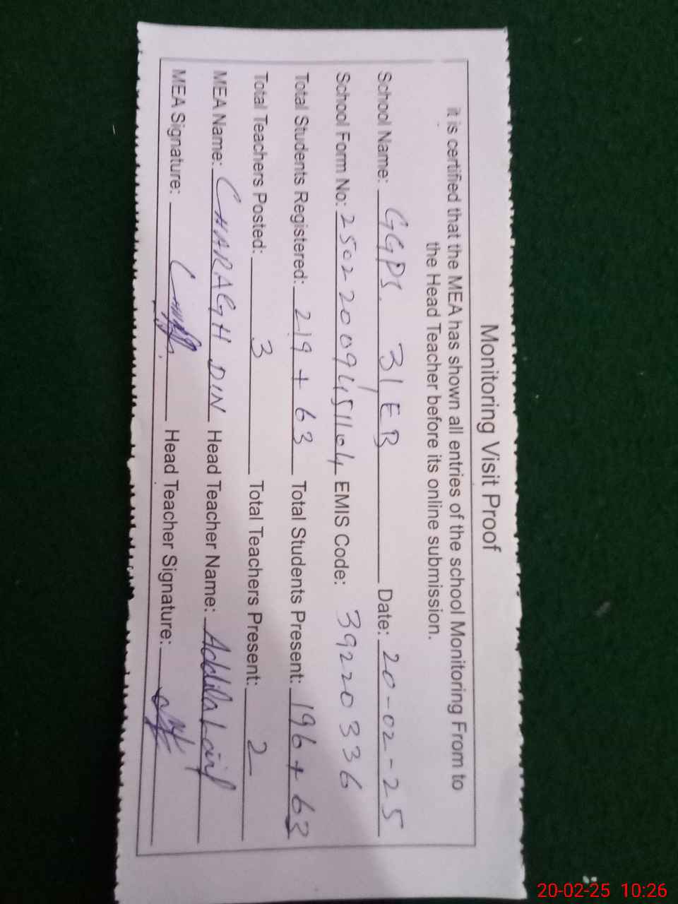 | Attendance Register | Head Teacher | MEA with School | Visit Proof |