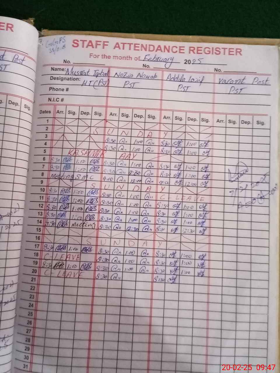 | CNIC | Full Name | Designation | R/C | Absence During Last Calender Month |