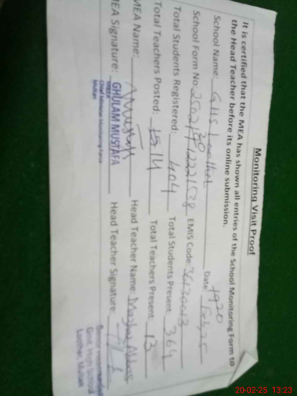 | EMIS Code: 36130013 | Name of School: GHS LOOTHER MULTAN | |||