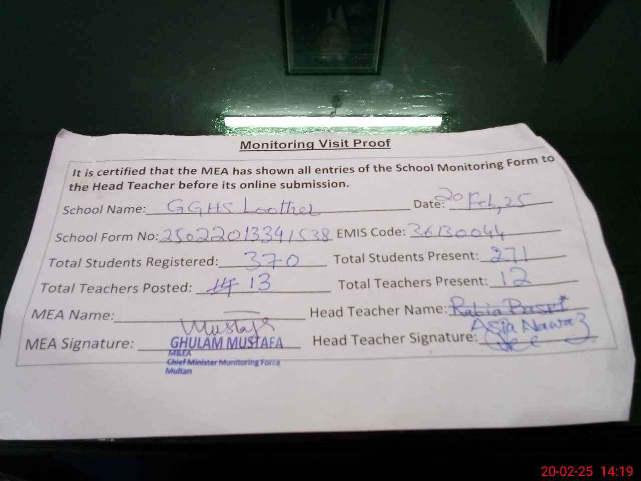 | Certified that this School was Inspected by the Undersigned MEA/DMO Today and the Information Stated Above is as Per Record. | |||||