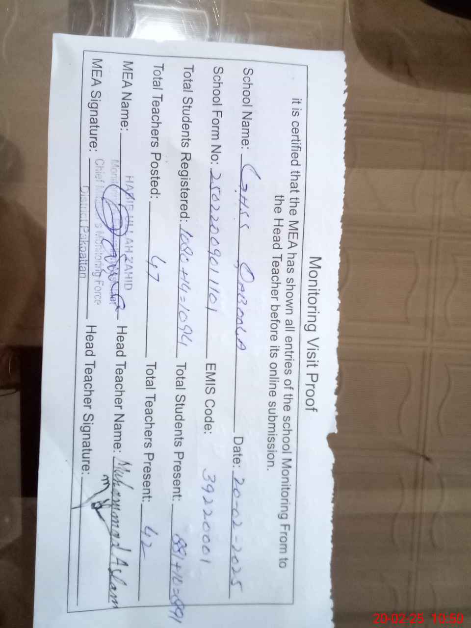 | Certified that this School was Inspected by the Undersigned MEA/DMO Today and the Information Stated Above is as Per Record. | |||||