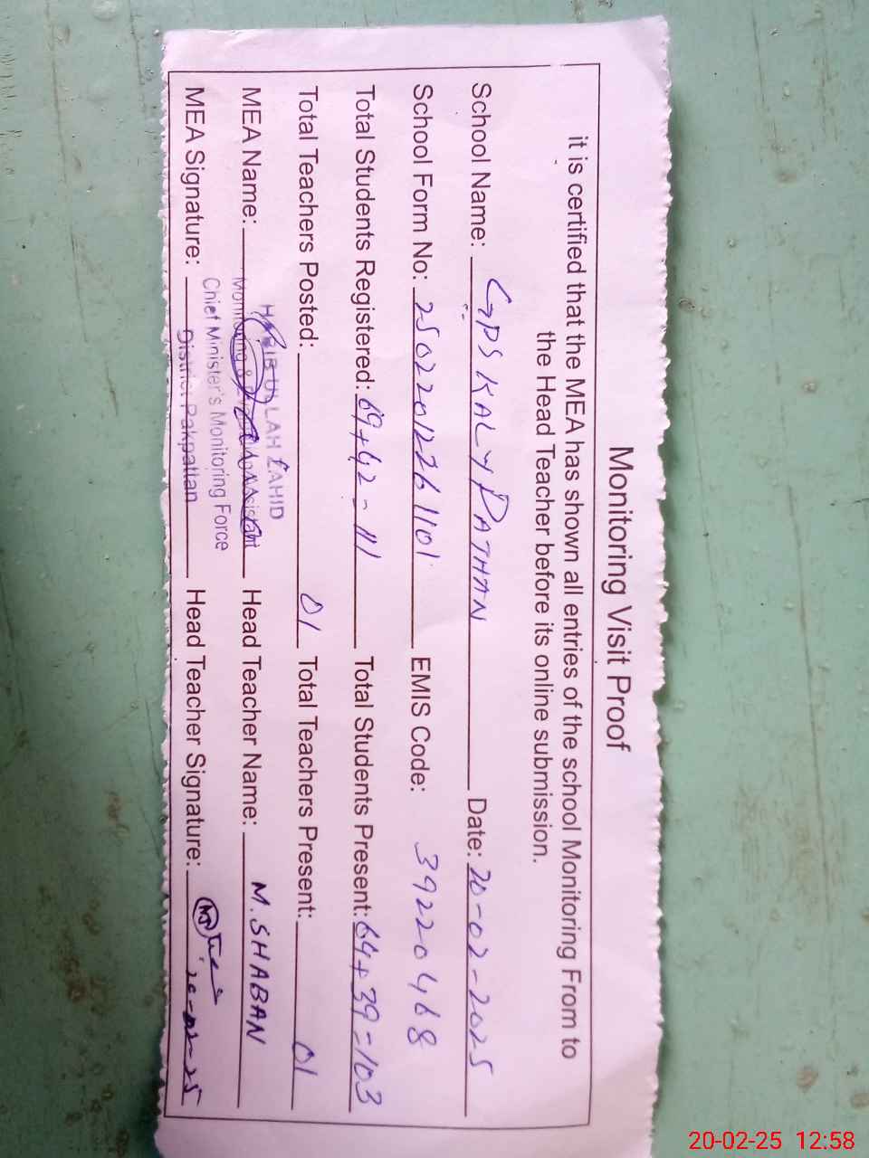 | EMIS Code: 39220468 | Name of School: GPS KALAY PATHAN NO 1 | |||