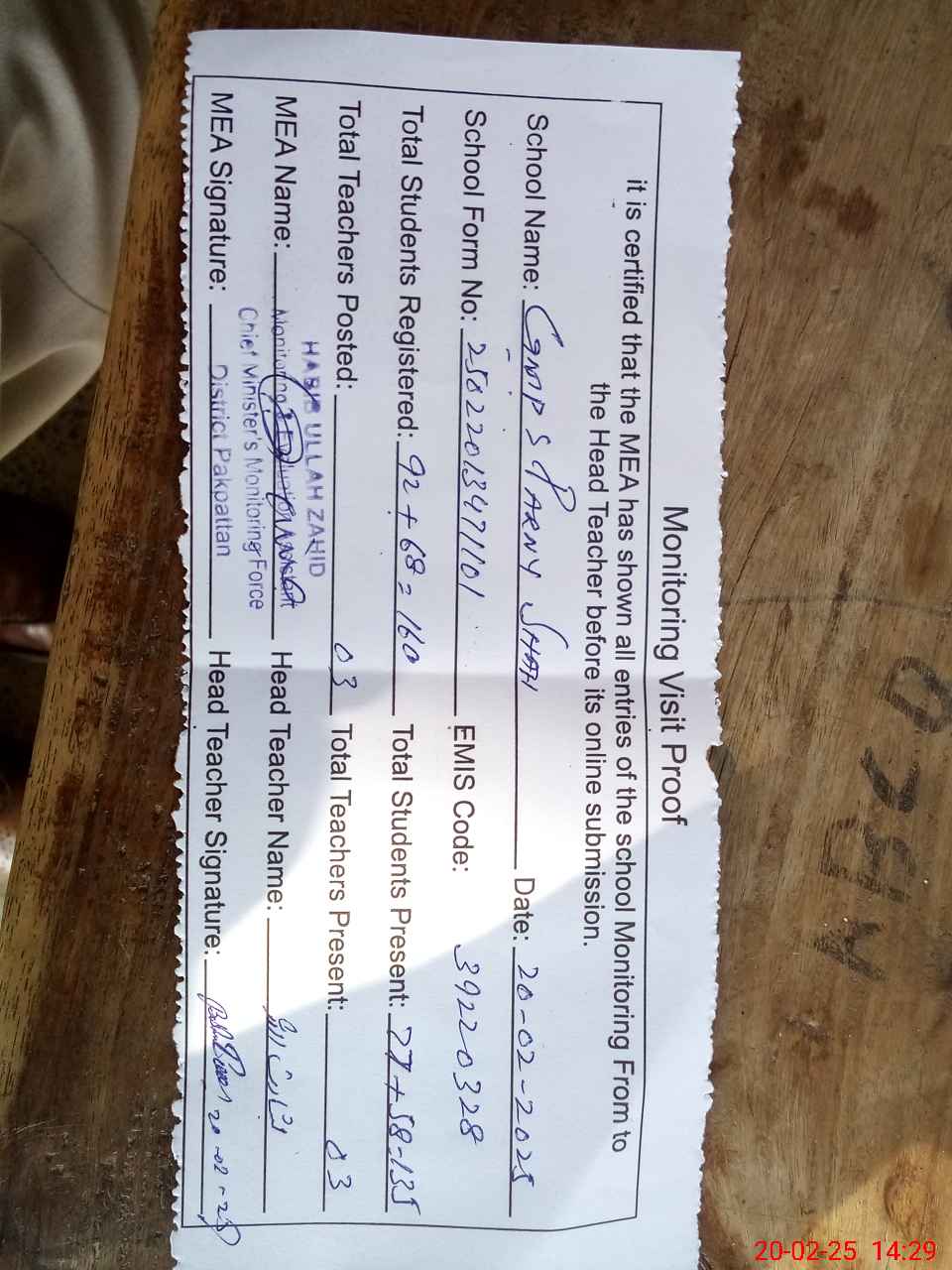 | Attendance Register | Head Teacher | MEA with School | Visit Proof |