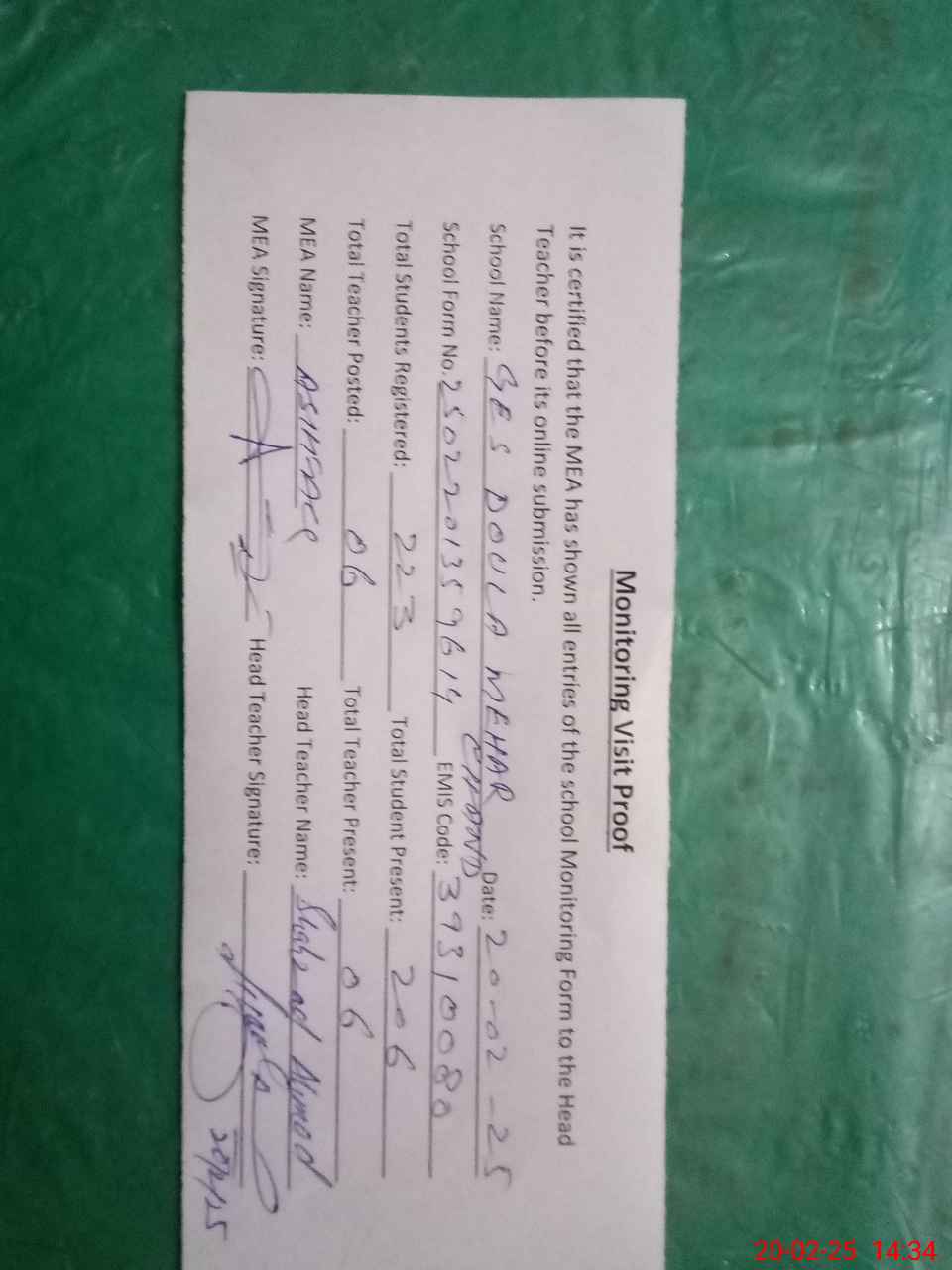 | Attendance Register | Head Teacher | MEA with School | Visit Proof |