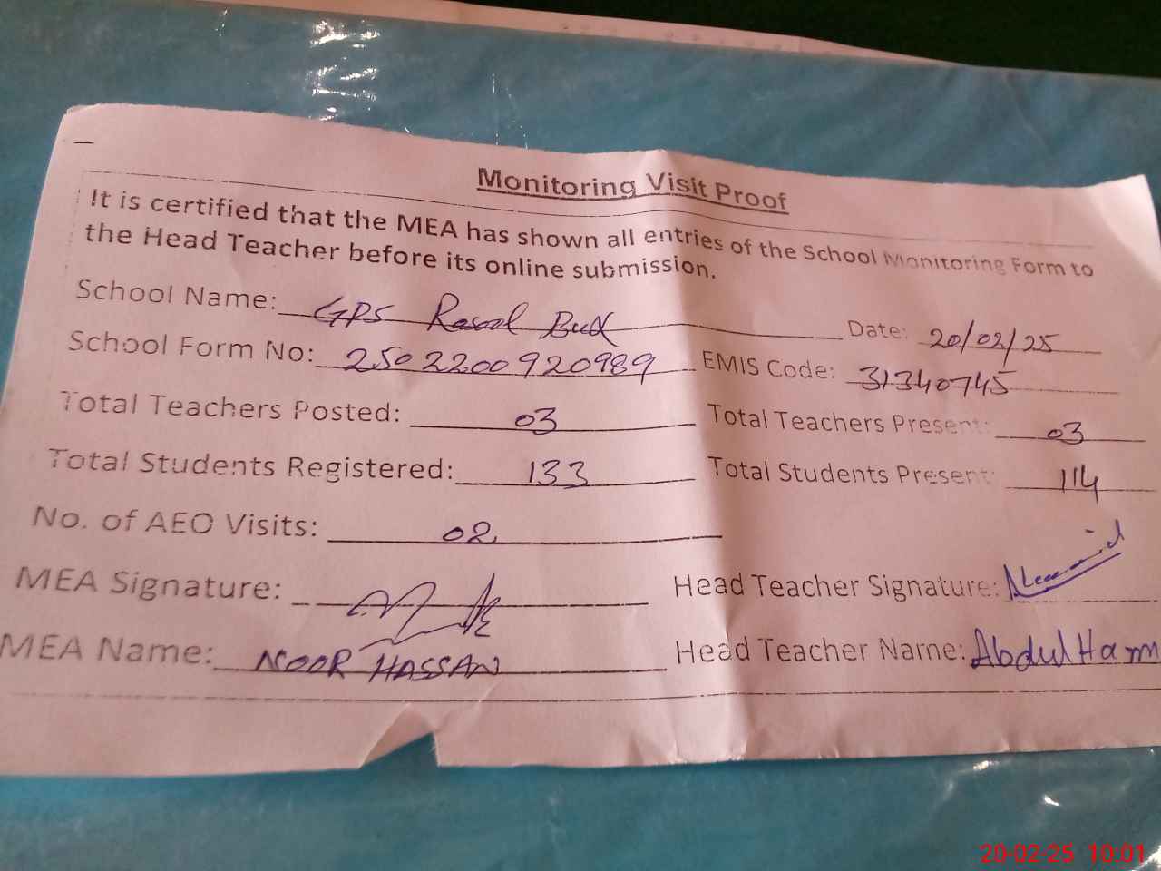 | Attendance Register | Head Teacher | MEA with School | Visit Proof |