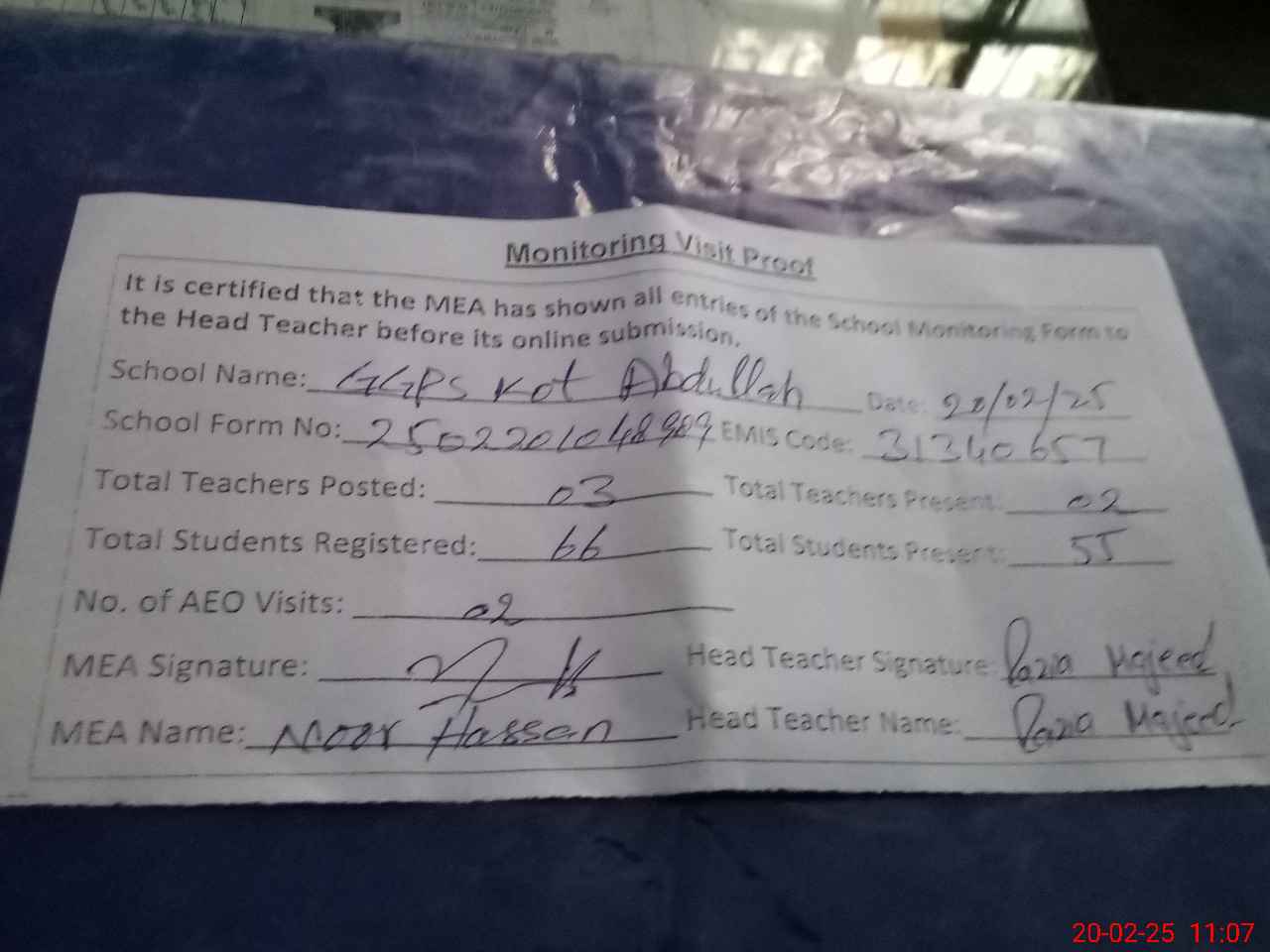 | EMIS Code: 31340657 | Name of School: GGPS KOT ABDULLAH | |||