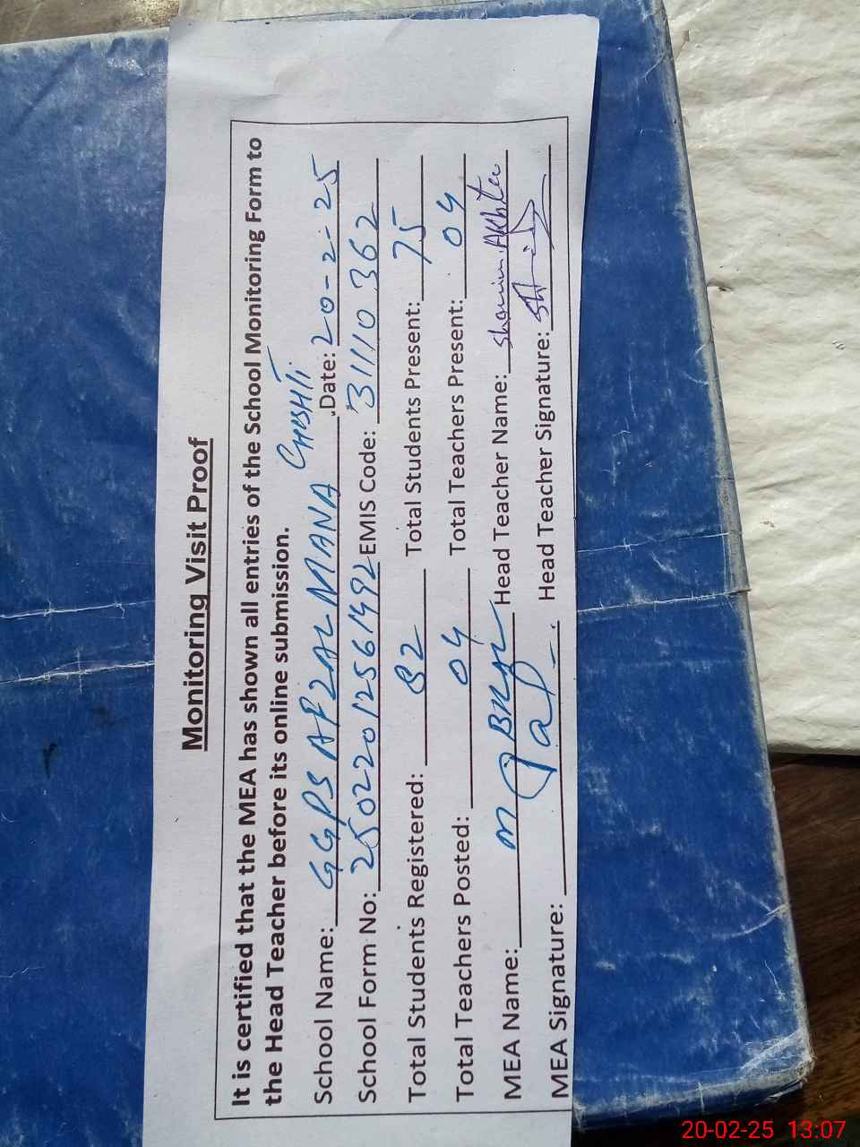 | Attendance Register | Head Teacher | MEA with School | Visit Proof |
