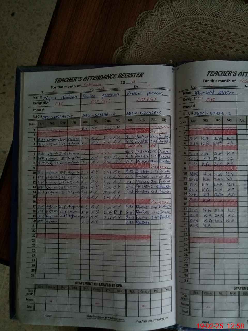 | CNIC | Full Name | Designation | R/C | Absence During Last Calender Month |