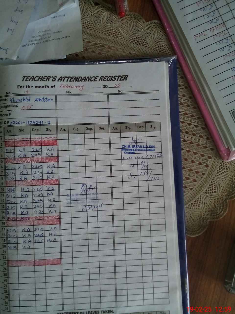 | CNIC | Full Name | Designation | R/C | Absence during last cal. month |