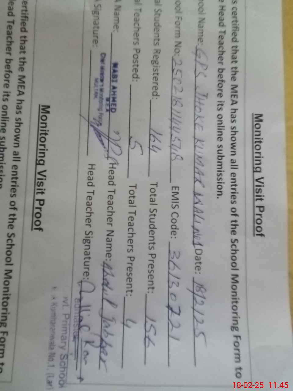 | Certified that this School was Inspected by the Undersigned MEA/DMO Today and the Information Stated Above is as Per Record. | |||||