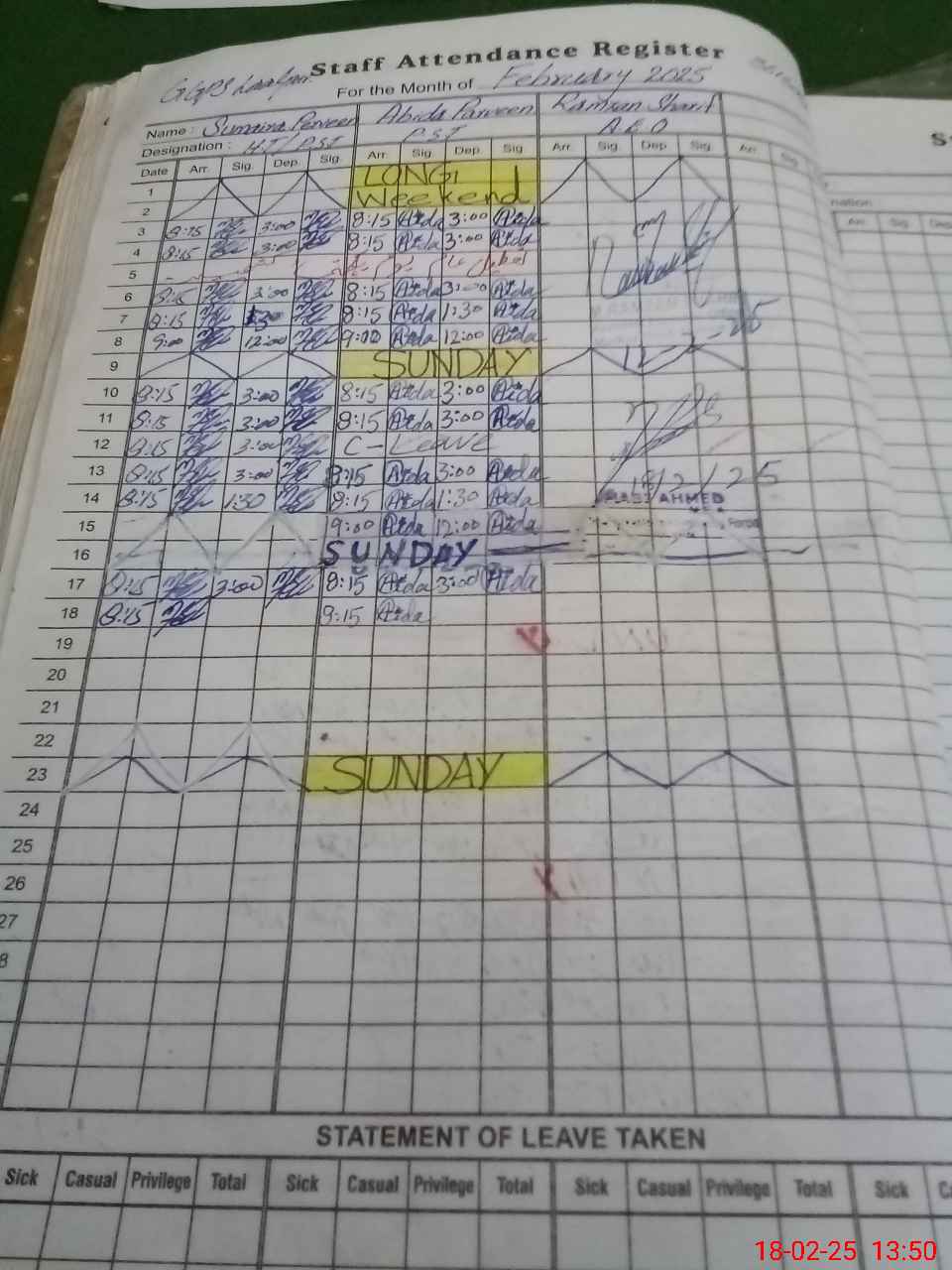 | CNIC | Full Name | Designation | R/C | Absence During Last Calender Month |