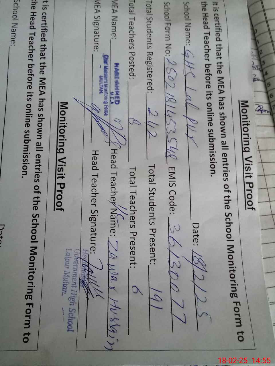 | Certified that this School was Inspected by the Undersigned MEA/DMO Today and the Information Stated Above is as Per Record. | |||||