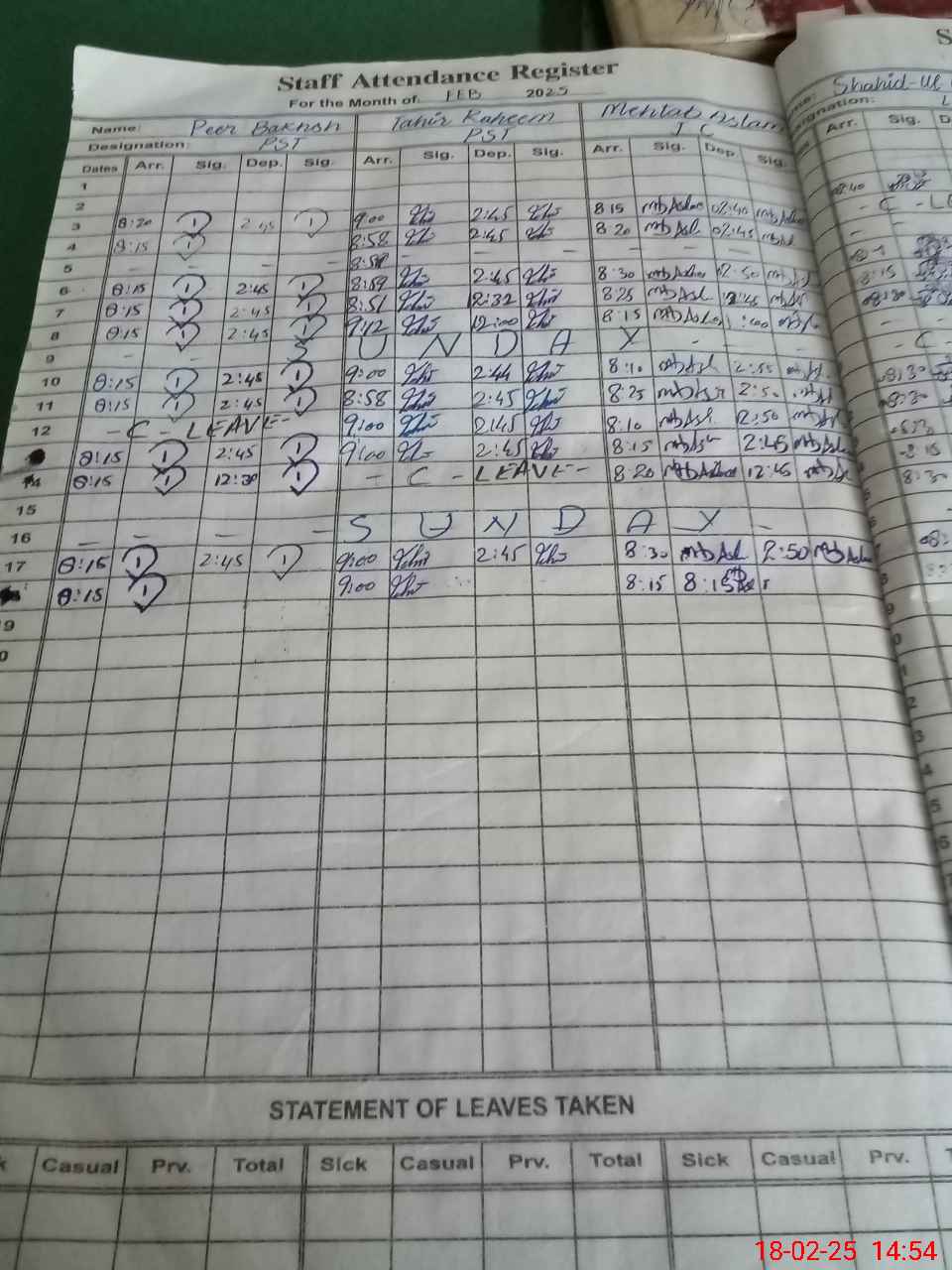 | CNIC | Full Name | Designation | R/C | Absence During Last Calender Month |