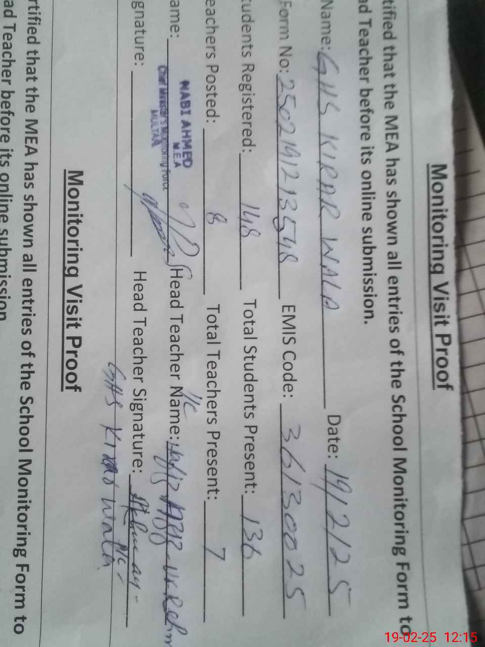 | EMIS Code: 36130025 | Name of School: GHS KIRAR WALA MULTAN | |||