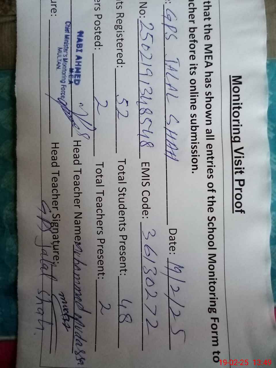 | EMIS Code: 36130272 | Name of School: GPS JALAL SHAH | |||