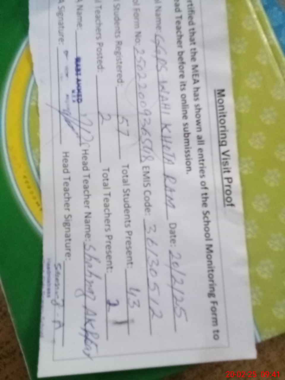 | Attendance Register | Head Teacher | MEA with School | Visit Proof |