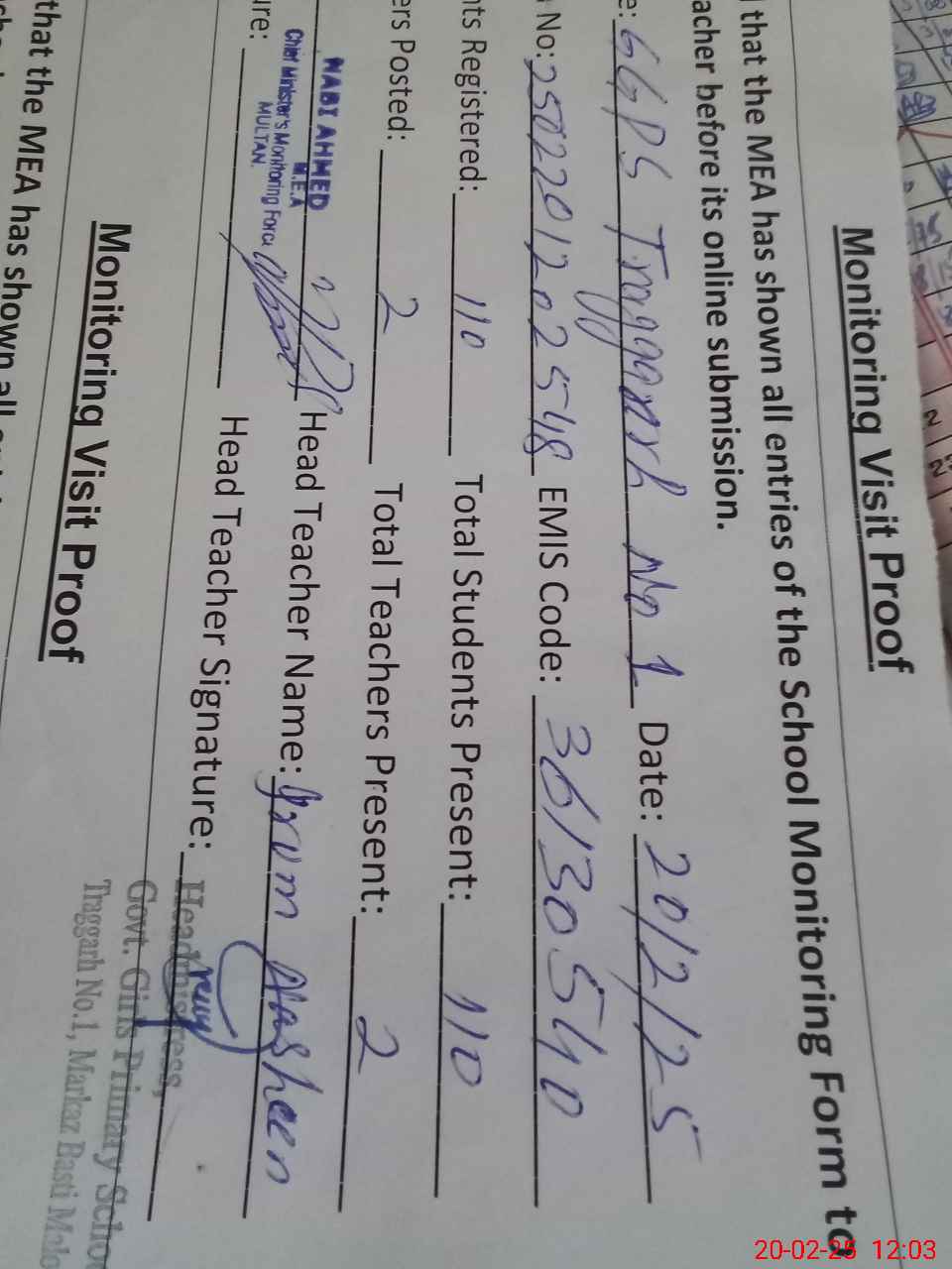 | Attendance Register | Head Teacher | MEA with School | Visit Proof |