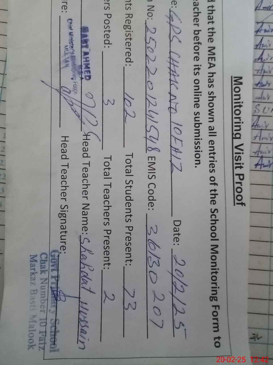 | Attendance Register | Head Teacher | MEA with School | Visit Proof |