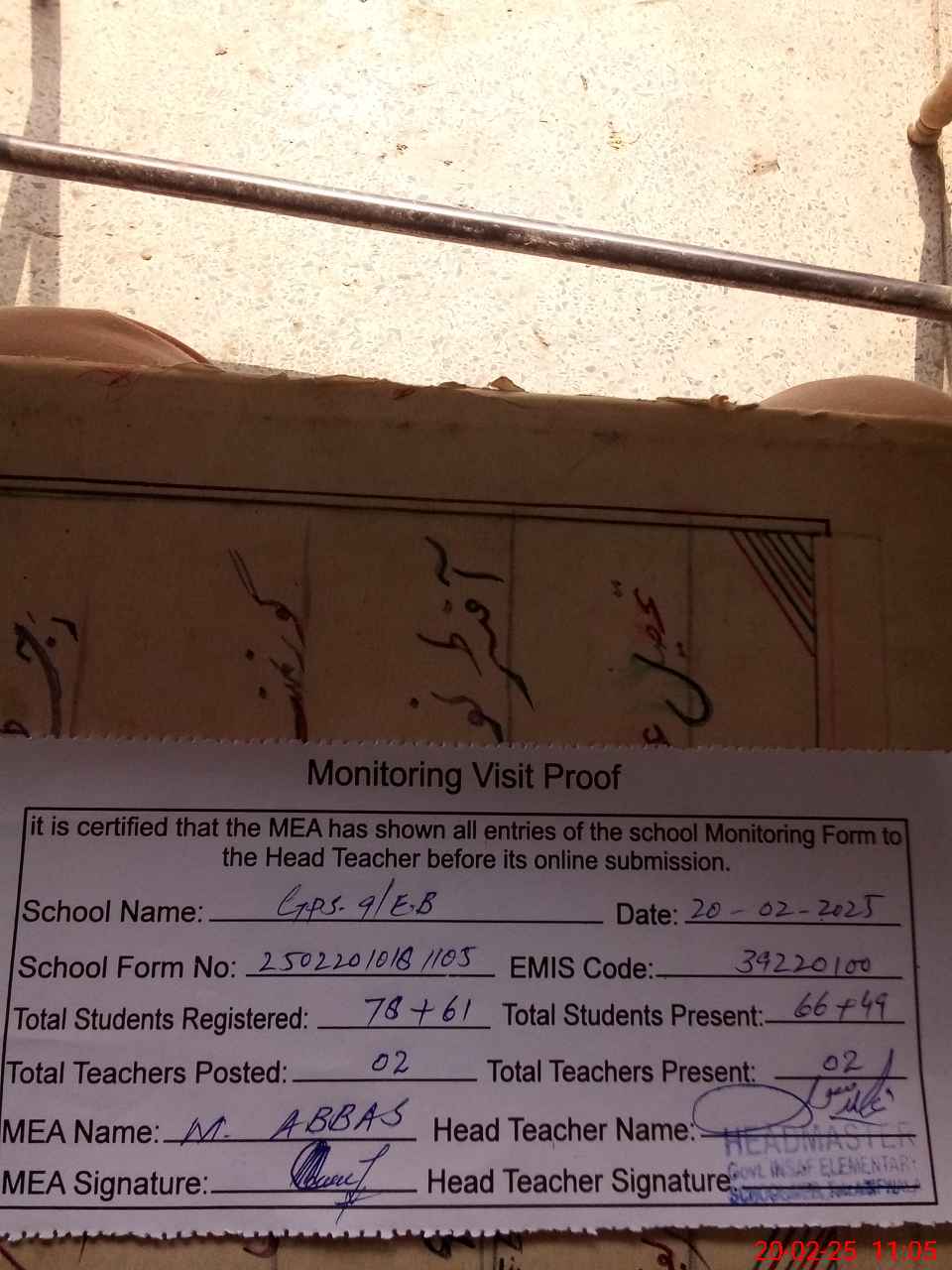 | Attendance Register | Head Teacher | MEA with School | Visit Proof |