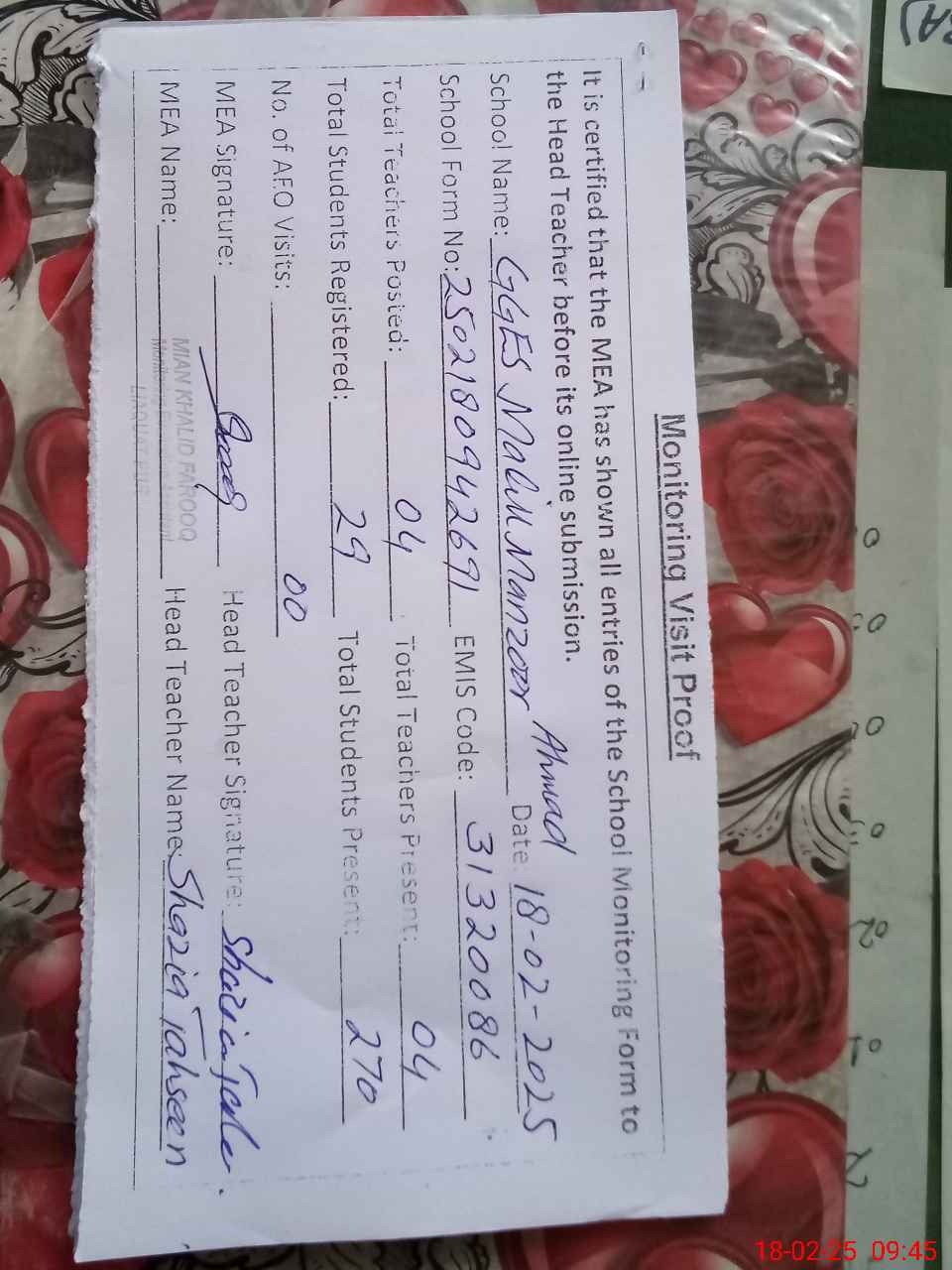 | Attendance Register | Head Teacher | MEA with School | Visit Proof |