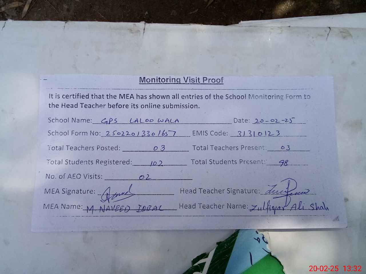 | Attendance Register | Head Teacher | MEA with School | Visit Proof |
