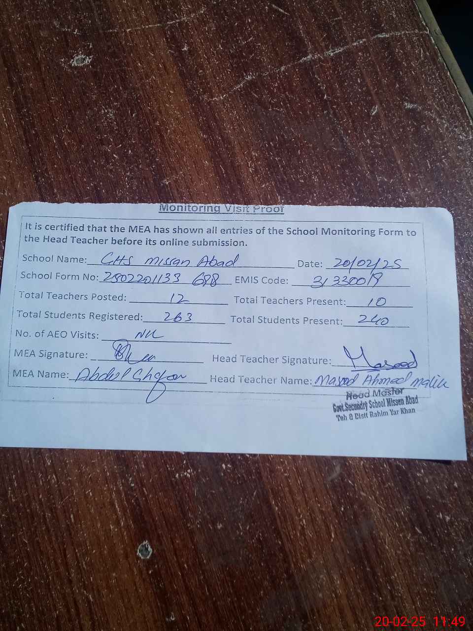 | Attendance Register | Head Teacher | MEA with School | Visit Proof |