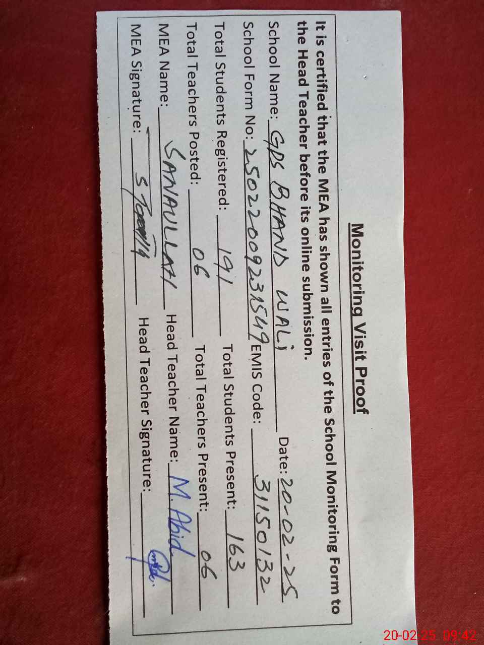| EMIS Code: 31150132 | Name of School: GPS BHAND WALI | |||